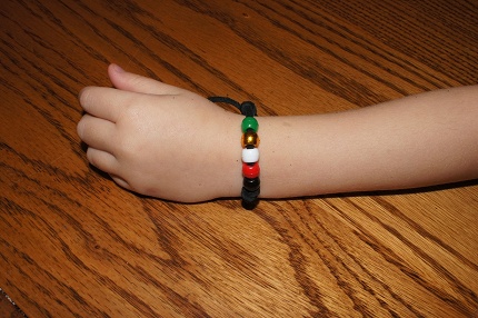 Feed the beads onto the cord in this order: Black, Red, White, Gold, Green.