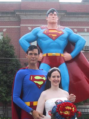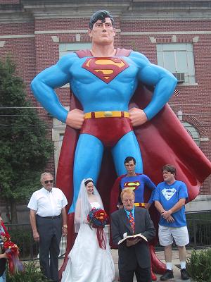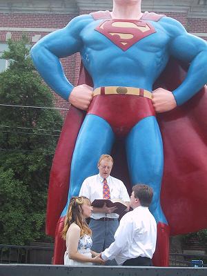 In 2004, Brother Hugh was able to perform a wedding on Sunday, June 11, 2006, on the last day of the Superman Celebration... Most of the Make It Clear Staff Members have been going to Metropolis for several years. This year, Christopher Dennis and Bonnie Finkenthal were married by Brother Hugh while David took pictures. Here are some links to go to if you want to check out the Superman Celebration and the wedding From the Jimmey Kimmel Live Show The State Journal Register in Springfield Illinois