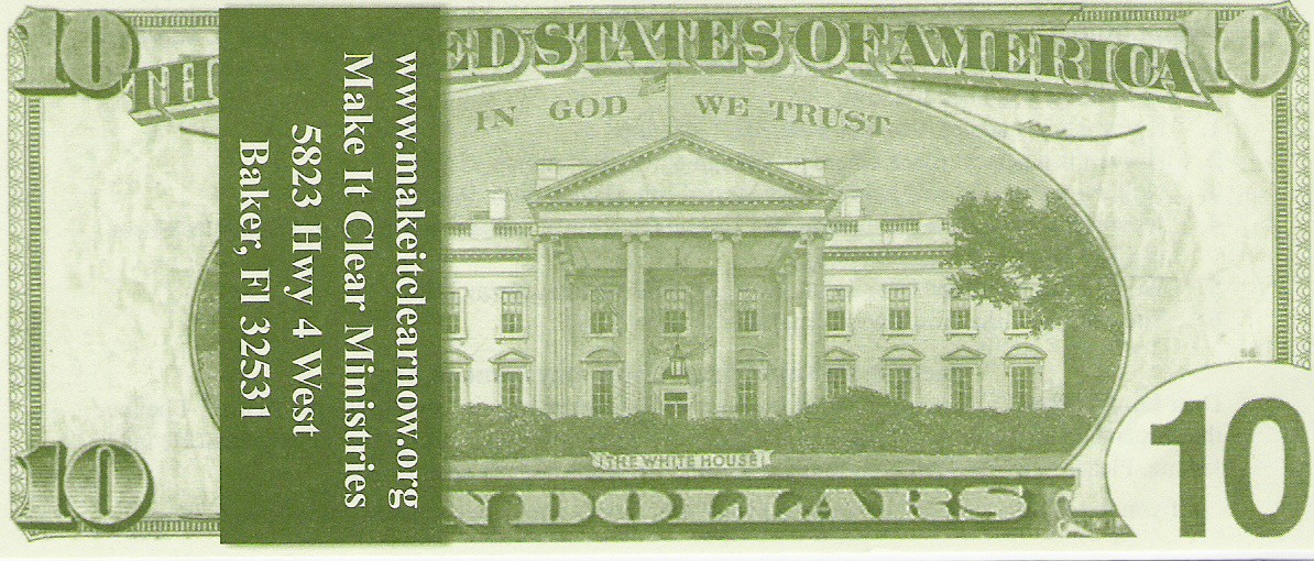 -Make It Clear Ministries now has a new version of our "$10 tract"- This tract is meant to grab a persons attention because it looks like a $10 bill. We fold it in half and then in half again so it looks a little more real. You can even crumple it a little so it looks like it has been in someones pocket for a while. I have seen many people pick it up and start laughing when they realize it isn't real money. Some people will hang on to it so they can play a joke on a friend of theirs. Please remember to never leave this tract with a tip when you are at a restraunt. We leave the blue tracts at a restraunt with the tip inside of it so the waitress doesn't get mad at Christians. If you would like a free sample of this tract, please write to Make It Clear Ministries, 5823 Hwy 4 West, Baker, FL 32531. Or you may purchase these tracts for 10 cents each from Brother Hugh at makeitclear@aol.com (If you order 100 or more, the shipping is free!) |