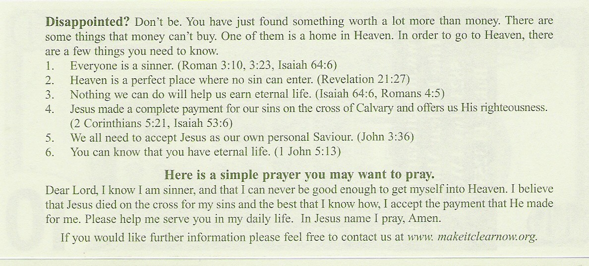 -Make It Clear Ministries now has a new version of our "Heaven... Would You Like To Go There When You Die?"- This tract is a simple presentation of the gospel which includes a sample "Sinner's Prayer." This is a great tract to leave a tip in at a restraunt for the waitress. Always remember that if you are going to leave a tract, you need to leave a generous tip so they will read it. I have worked in many restraunts and they don't usally look forward to Christians being their customers because Christians are usally lousey tippers. If you are trying to win them to the Lord, don't make them mad at God through you. If you would like a free sample of this tract, please write to Make It Clear Ministries, 5823 Hwy 4 West, Baker, FL 32531. Or you may purchase these tracts for 10 cents each from Brother Hugh at makeitclear@aol.com (If you order 100 or more, the shipping is free!) |